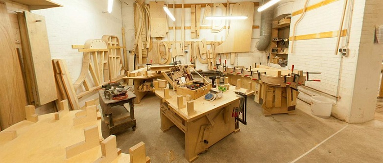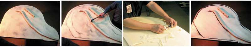 УШ: Дека для каждого рояля изготавливается по индивидуальному проекту. Двух одинаковых деревьев не бывает, как и готовых установленных стандартов для резонанса. И хотя станки с программным управлением весьма точны, дерево не является стабильным или единообразным материалом. Ручной труд здесь является единственным методом. Например, каждая наша дека после установки в футор рояля тестируется с помощью песка. Дека посыпается песком, и мы простукиваем штег, чтобы определить недостаточно звучащие участки – на них песок останется неподвижным. Ручной доводкой этих областей путём снятия тончайших слоёв древесины мы создаём мембрану, как в динамике акустической системы, которая способна свободно вибрировать. Благодаря таким манипуляциям дека становится очень «живой».