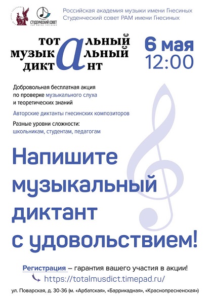 6 мая Российская академия музыки имени Гнесиных проведёт «Тотальный музыкальный диктант» - добровольную бесплатную акцию по проверке музыкального слуха и теоретических знаний для всех желающих.