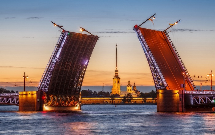 Увидеть светомузыкальное шоу «Поющие мосты» можно каждую ночь в 1.00 у Дворцового моста.