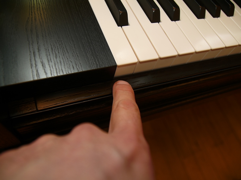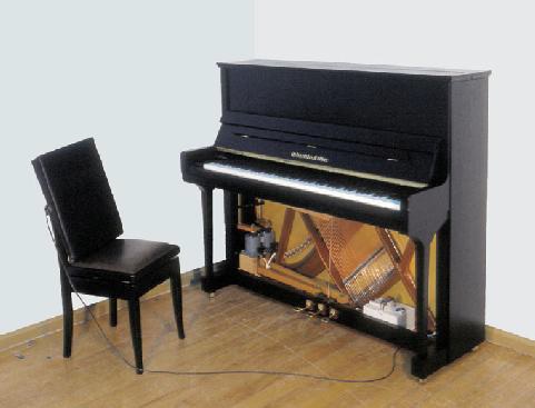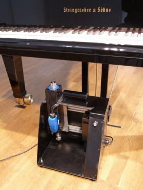 На фото: приводное мобильное устройство для управления педальным механизмом пианино (на фото показано неверное положение – в действительности, устройство должно располагаться за педальным механизмом)