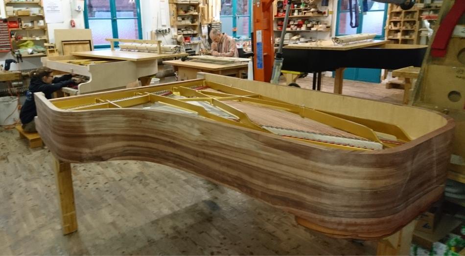 Параллельно заканчивается работа над отделкой шпоном тинео внутренней обечайки корпуса большого концертного рояля E-272 – флагманской модели Steingraeber.