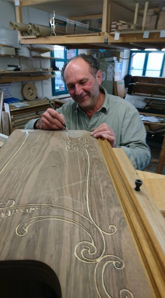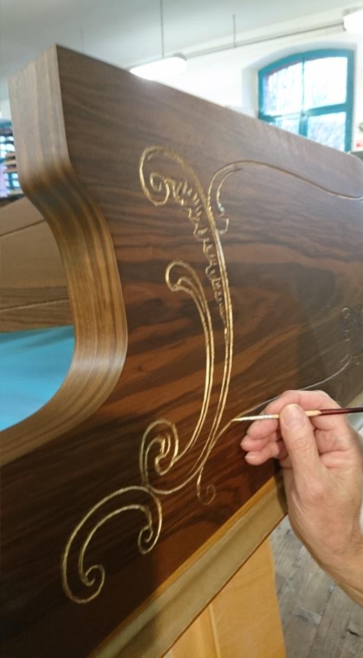 Например, прямо сейчас на производстве Steingraeber готовятся сразу несколько превосходных роялей из очень необычного дерева – тинео. В частности, шпоном древесины тинео полностью покрыта дизайнерская модель "Renaissance", и мастер уже приступил к декору инструмента.